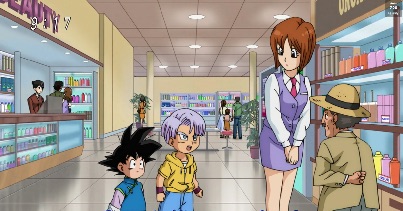 Après un bref passage insatisfaisant chez un bijoutier où ils ont effrayé des clients, effarés de voir deux personnes flotter dans les airs, Trunks se souvient alors de sa mère Bulma qui déclarait vouloir offrir un nettoyant pour visage à Videl.