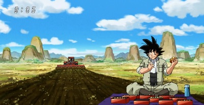 - ATTENTION SPOILERS -Annoncée le 28 avril par le studio Toei Animation, la nouvelle a eu l‘effet d’un kaméhaméha. "Dragon Ball Super sera la suite de la saga Majin Buu" avait révélé Toriyama lors d'une interview au magazine V Jump. "Il y aura d’abord un court moment où l’on racontera l’après bataille, puis la série enchaînera sur la saga Battle of Gods où Beerus, le Dieu de la Destruction apparaît, ensuite arrivera la saga Résurrection de F pendant laquelle Freezer revient à la vie". En d’autres termes, le dessin animé fait suite directement à Dragon Ball Z, mettant complétement de côté la série Dragon Ball GT, pour la plus grande joie des fans qui l’avait peu appréciée et à laquelle le mangaka n’a pas contribué. Pour ceux qui n’auraient pas eu le courage ou le temps de regarder l’épisode diffusé au Japon, dimanche 5 juillet à 2 heures 30 du matin, voici ce qu'il faut retenir du premier épisode intitulé Le prix de la paix : À qui revient les 100 millions de zenis ? : 1) Un flash-back ouvre l’épisode avec un résumé - construit à partir des images d’origine - de la bataille épique contre Boo, de sa défaite et de la paix régnant depuis 6 mois. 2) L’épisode commence avec Sangoku dans un champ de labour sur un tracteur Capsule Corp, la marque emblématique du dessin animé. L’héritage de son beau-père n’étant plus, il est contraint par son épouse Chi Chi de travailler afin de subvenir aux besoins de sa famille. Clairement, l’ennui se fait sentir. Pourquoi doit-il labourer au lieu de s’entraîner pour devenir plus fort et se parer à toute éventualité d’attaque contre la Terre ? Après avoir englouti un déjeuner gargantuesque, il se transforme en Super Saiyan et commence à s’exercer. Goten est alors seul à conduire le tracteur et tombe d’une falaise. Goku d’un mouvement rapide et instantané sauve Goten en attrapant l’engin par une main.
