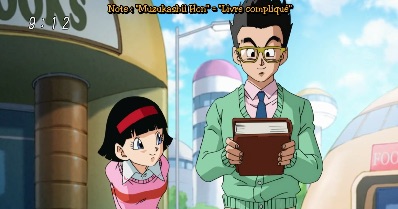5) Pendant ce temps, Videl et Sangohan marchent ensemble. Comme Gohan est étudiant en sciences, Videl vient de lui offrir un livre. Il se sent gêné de se voir tout offrir par sa future femme et coupable de ne pouvoir faire de même car sans pécule.