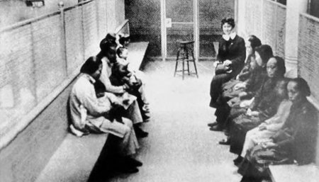 Des Chinoises et des Japonaises attendent d'être reçues au centre de réception d'Angel Island dans les années 20. (AP/Wide World Photos)