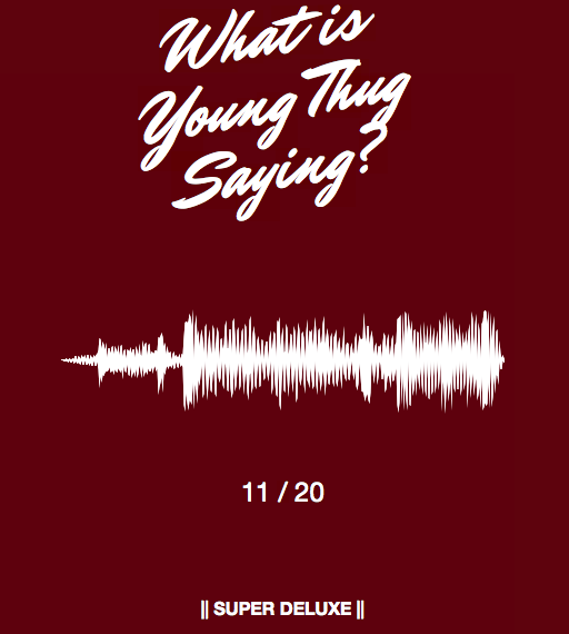 Appelé What is Young Thug Saying ? (traduit : Que raconte Young Thug), le test permet de se confronter au baragouinage du rappeur et de tester vos connaissances de la manière suivante : 20 questions composées d'un mini extrait d'un de ses titres et de quatre réponses au choix vous sont proposées. Un résultat final sur 20 vous est attribué à la fin du test. La rédaction, qui se croyait pourtant experte, n'a pas réussi à obtenir une meilleure note que 12/20. Et vous ?