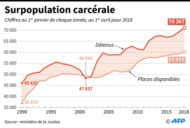L'évolution de la surpopulation carcérale - AFP, Ministère de la Justice.