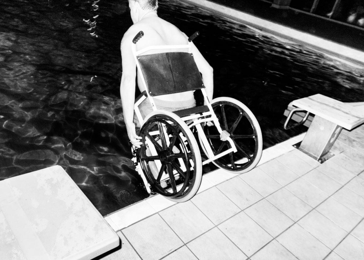 "Une nuit de canicule à Paris je reçois un coup de fil : "ça te dit d'aller à la piscine cette nuit ?". Sauter des barrières, passer des portes, arriver dans une piscine publique vide et boire des verres en jouant avec les équipements pour handicapés".