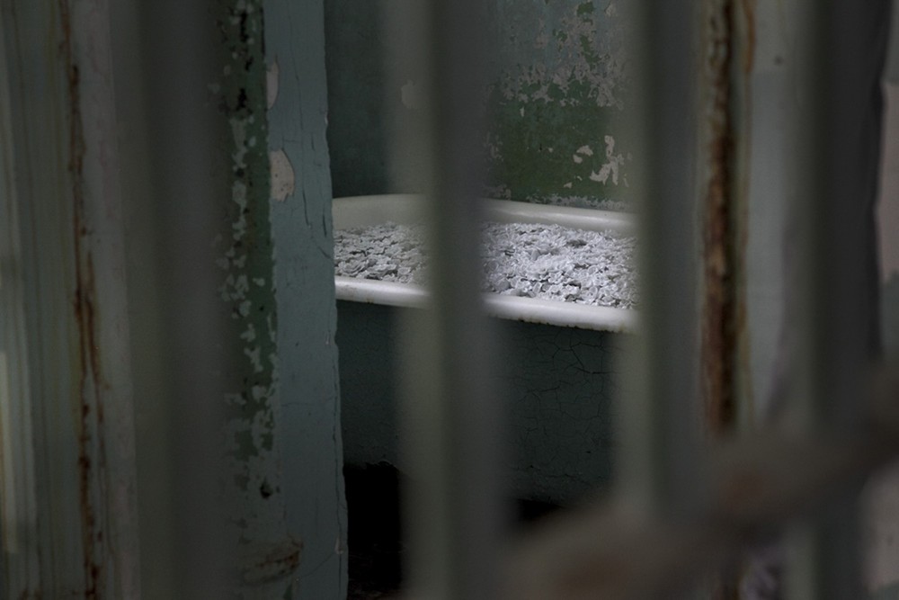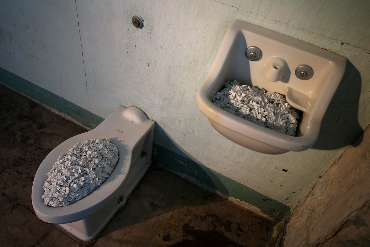 Baignoire remplie de fleurs blanches en céramique. L'une des installations de l'artiste chinois Ai Wei Wei dans la prison d'Alcatraz, aux États-Unis (2014)