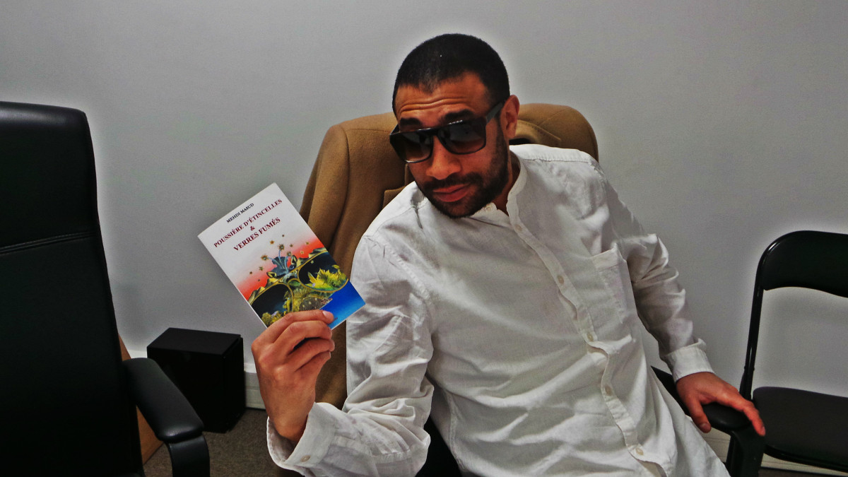 À travers les 100 pages de "Poussière d'étincelles et verres fumés", on retrouve cette certitude que l'homme est cinglé. Les verres fumés de son titre, Mehdi Masud les garde d'ailleurs sur le nez en permanence. Il nous parle de son bouquin à coup de punchlines.