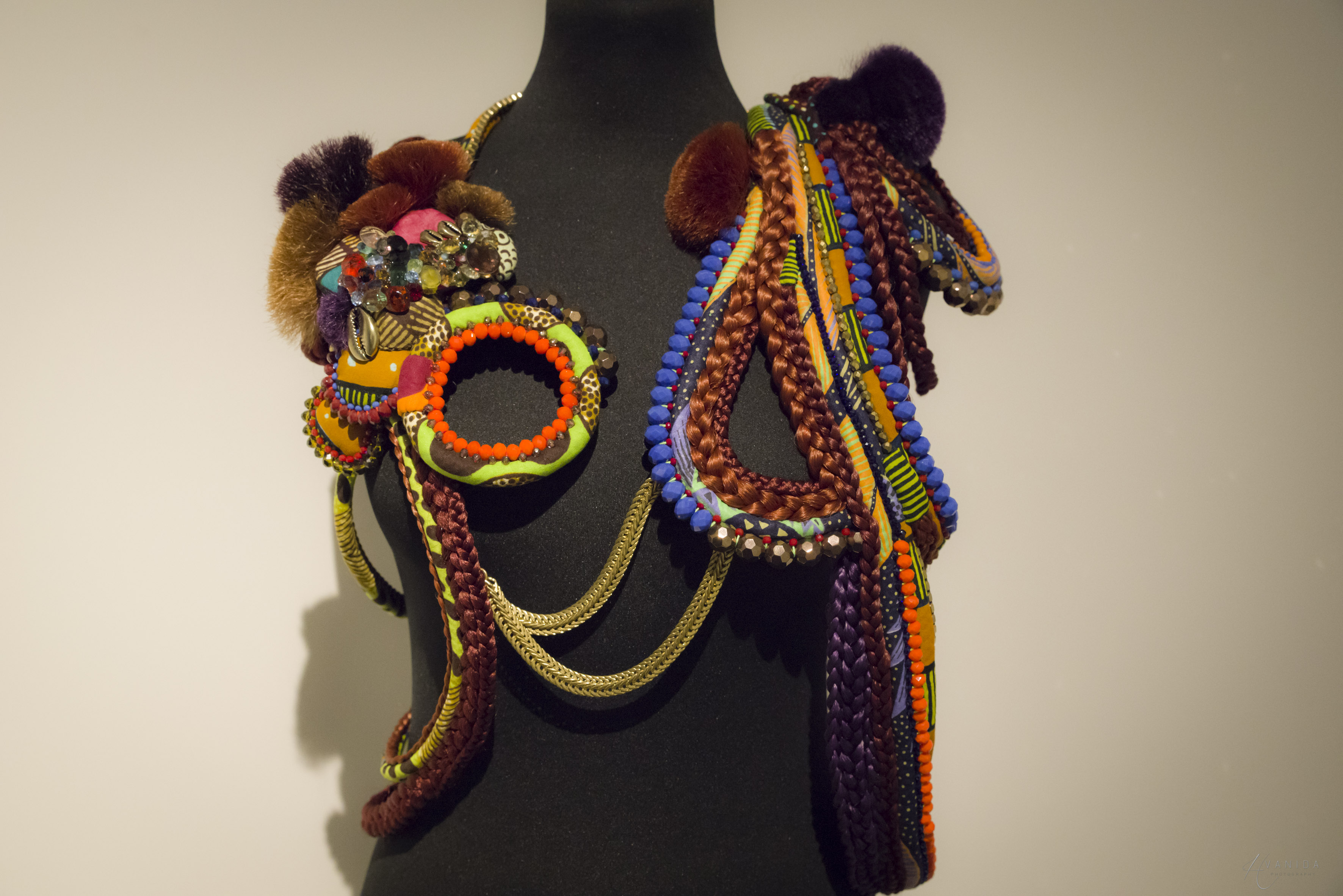 Qui était-ce ? C'est Stéphanie Lambert. Finalement mes créations sont plus dédiées au monde du cinéma, du show-business, des gens qui ont besoin de se faire remarquer. Ce n’est pas le genre de création qui se porte tous les jours, hormis quelques pièces que j’ai réalisées avec d’autres artistes (la parure bijoux par exemple, ou la petite veste avec du bazin). Ce sont des créations que l’on peut encore porter parce que ça reste soft. [caption id="attachment_56269" align="alignnone" width="3543"]