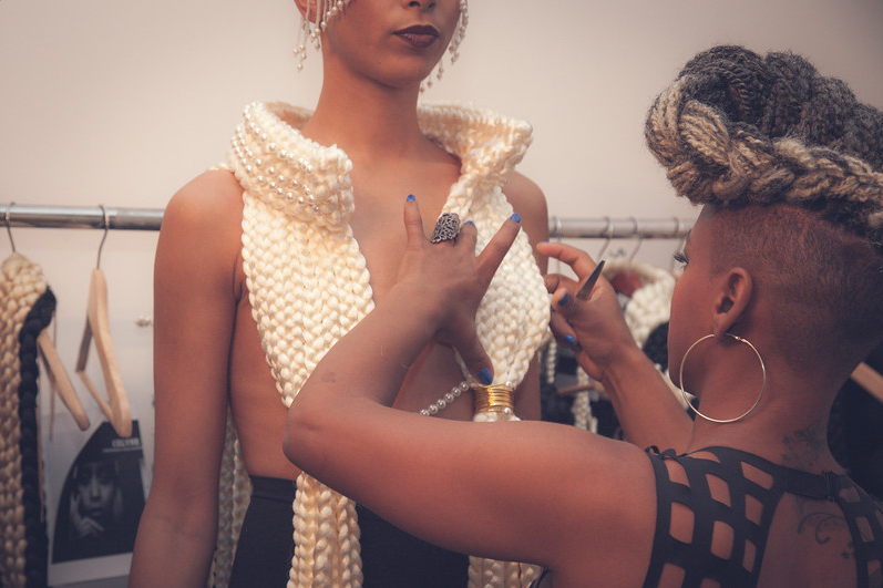 Est-ce qu’une de vos créations a été particulièrement difficile à réaliser ? Pour moi la plus grosse difficulté, c’était de tout faire tenir. C’est du moulage, donc j’ai appris à mouler sur le corps : quand on tresse directement sur le corps, ça prend la forme du buste. Je peux donc vraiment former les tailles, la poitrine etc. avec les tresses. Mais c’est vrai qu'au début, la plus grosse difficulté était de voir comment je pouvais tout mouler, donner les formes, adapter les fermetures... Et surtout de voir comment un mannequin peut l’enfiler, sachant que c’est des cheveux et que c’est très fragile. Quand je crée, je suis comme une gamine ; j’aime expérimenter et me donner des défis, travailler une matière difficile à exploiter à la base. [caption id="attachment_56303" align="alignnone" width="342"]
