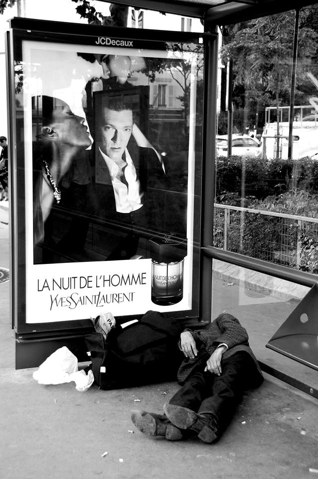 Le petit « coté social », c’est l’idée de prendre conscience de ce qui nous entoure. Les SDF, je les prends toujours avec une histoire, en bas de chez Cartier par exemple. Je ne fais pas de gros plan. Il y a un contraste qui peut apporter le sourire : j’essaye de sublimer mon sujet. Je ne vais jamais rabaisser la nature de la personne, la dénigrer. C’est très important, surtout pour ce type de photos.