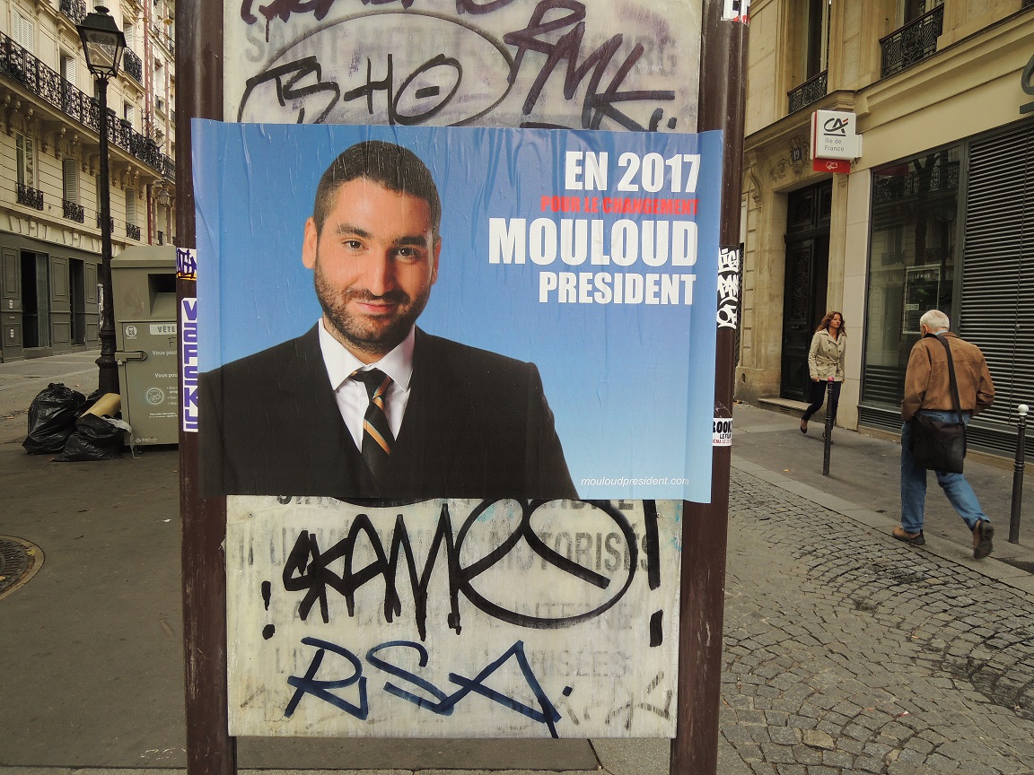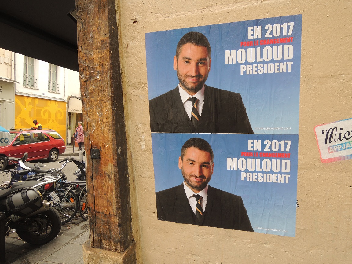 "Spectateur d'une scène politique dissonante et sclérosée, l'artiste JMG a décidé de parodier le parrainage des 500 signatures permettant d’accéder à la course au poste le plus prisé du pays", voici le message que l'on peut lire sur le site mouloudpresident.com. Derrière cet affichage sauvage parisien se cache Jean-Marie Georgelin, street artiste français. Rencontre avec ce responsable de centre d'appel lyonnais qui a tapissé les murs des quartiers de la capitale avec ses affiches.