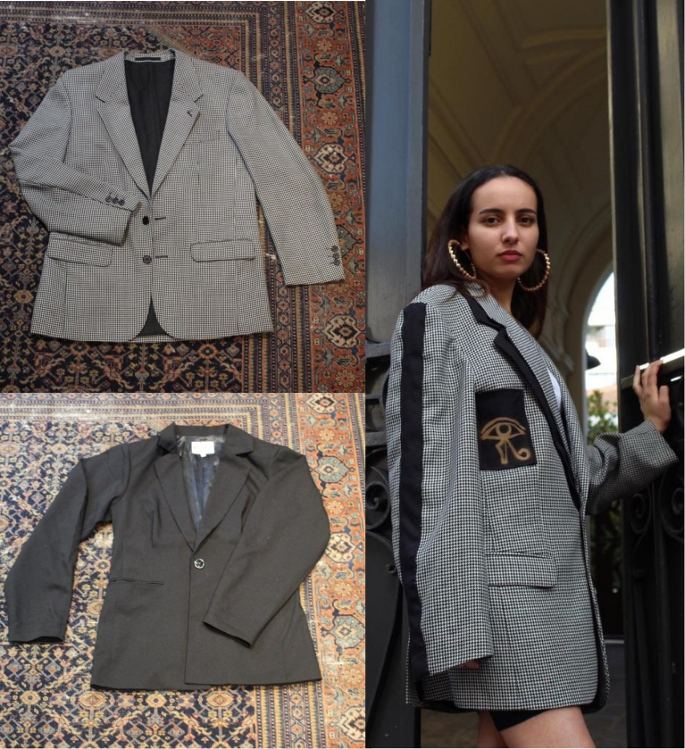 Une veste confectionnée à partir de deux vestes récupérées.