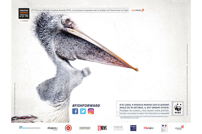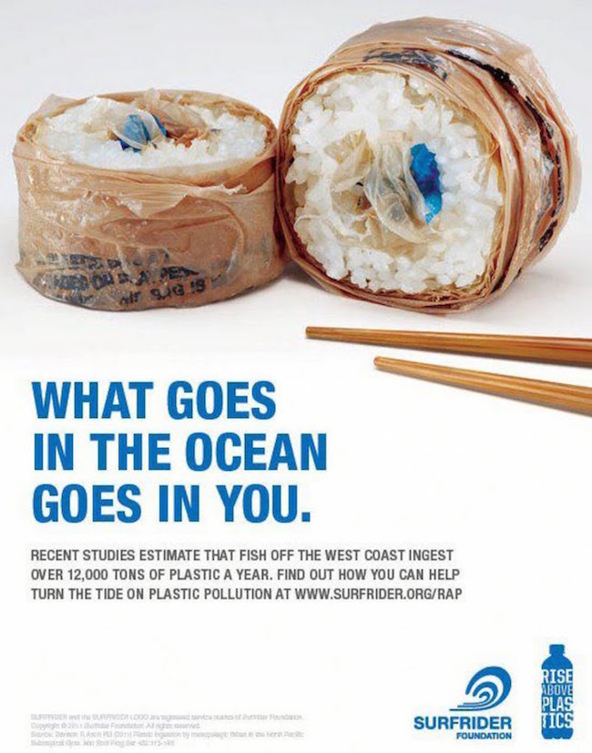 "Ce qu'on trouve dans l'océan se retrouve dans votre estomac : des études récentes estiment que les poissons de la Côte ouest (des États-Unis, NDLR) ingèrent plus de 12 000 tonnes de plastique par an." - Campagne de communication de l'ONG Européenne Surfrider Foundation.