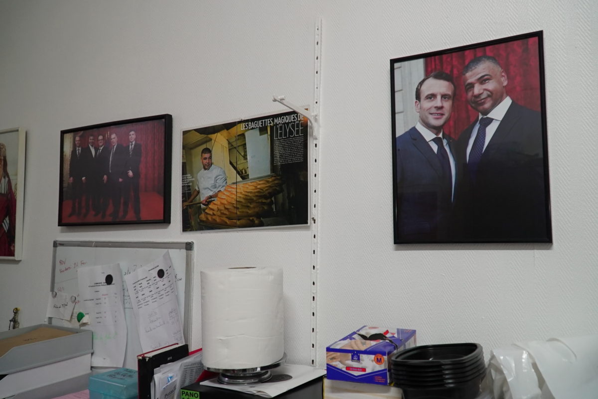 Dans l'arrière-boutique de sa boulangerie (14ème arrondissement de Paris), Emmanuel Macron fait partie du décor.