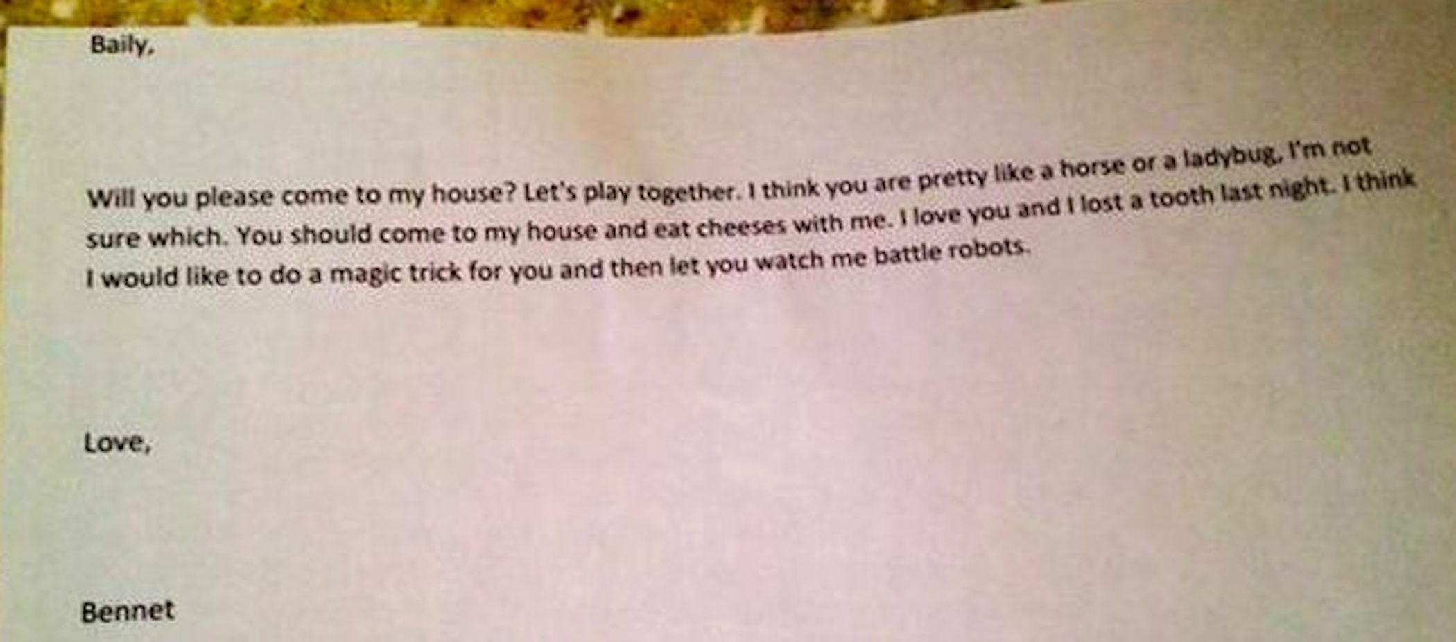 Il n'a que 4 ans, mais Bennet a déjà tout compris à la drague. Cette missive spontanée, emplie de jolies promesses, est destinée à Baily, une petite camarade d'école dont il est est fou amoureux. Il a suffi que sa mère, Jennifer, poste la missive sur le site Reddit la semaine dernière,
