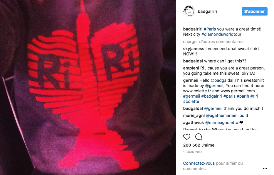 Le poste Instagram de Rihanna portant un pull "Riri" de Germeii, juin 2013