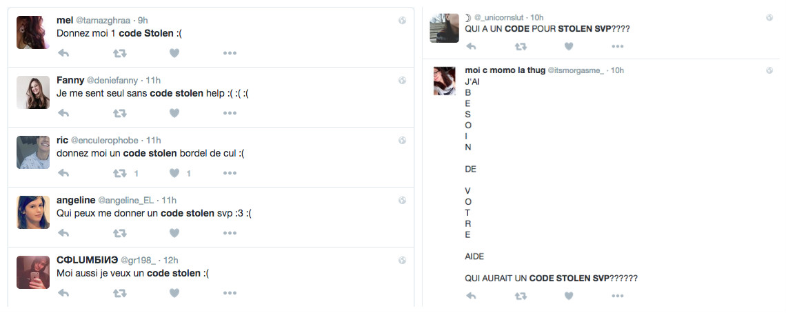 Stolen! est un plaisir d'initiés. Pour le moment, l'application n'est disponible que sur iOS, et seulement pour les personnes disposant d'un code d'invitation, offert à chaque inscription. Cette envie de faire partie des premiers motive des utilisateurs de Twitter à quémander des codes à tout va. Les chanceux vont même jusqu'à proposer de
