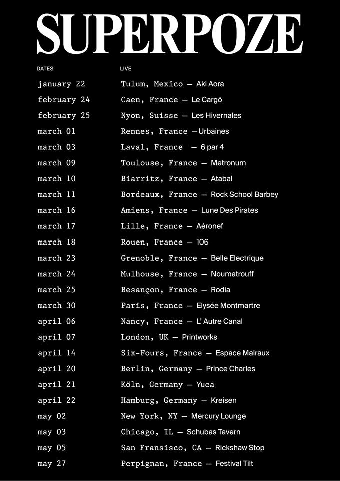 Superpoze, qui sera bientôt rédacteur en chef invité de Clique, inaugure également une tournée un peu partout dans le monde. Ses dates sont à découvrir ci-dessous :