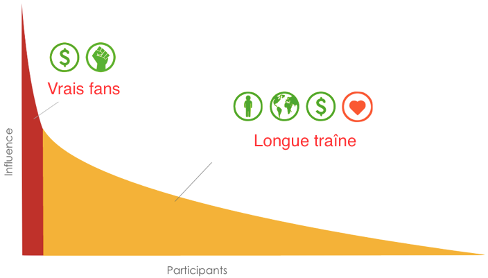 Pour avoir une clé de compréhension plus adéquate, il faut peut-être se pencher sur la "théorie des 1 000 vrais fans" avancée par l’économiste Kevin Kelly.On peut résumer cette théorie simplement : pour gagner sa vie et pouvoir vivre de son art, un créateur doit posséder une base de 1 000 vrais fans qui composeront un noyau lucratif durable. L’économiste considère qu’un vrai fan sera capable de dépenser environ 100 dollars par an pour acheter des produits en rapport avec la personne qu’il suit fidèlement. Ce noyau lui permettra de ne pas se faire happer par ce que l’économiste appelle "la traîne" - soit la courbe qui représente le ventre mou et majoritaire d’un ensemble d’abonnés. Ceux qui ne seront jamais (ou très peu) créditeurs. [caption id="attachment_48633" align="alignnone" width="704"]