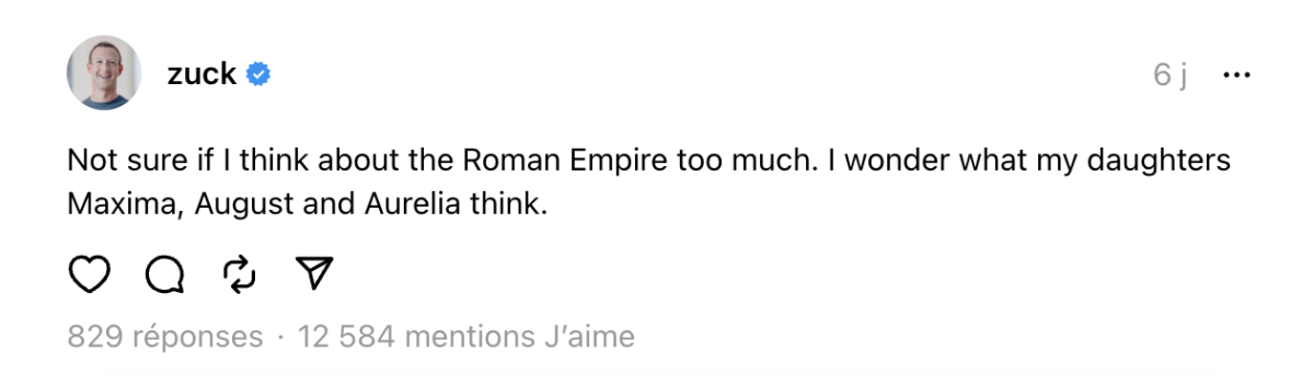 “Il est beaucoup question de batailles, d’armées et de généraux. C’est pour les mêmes raisons que l’on voit beaucoup de pères s’intéresser à la Seconde Guerre mondiale, à la guerre de Sécession ou à l’ère napoléonienne : il y a quelque chose qui attire les hommes vers ce genre de choses militaires” (entretien avec le magazine Rolling Stone)Parce qu’un homme, un vrai, ça aime la bagarre Plusieurs commentaires rappellent aussi qu'au-delà de la puissance militaire romaine, la technologie, l’architecture, la politique ou même le langage font largement partie de notre culture. Au cinéma, dans la littérature ou même dans les références faites par les politiciens, l’empire romain est toujours bien présent. La BD Astérix, le film Gladiator, la série Roman Empire, le jeu vidéo Age of Empire y font des allusions directes mais on trouve aussi des inspirations plus éloignées dans d’autres films cultes comme Star Wars ou ceux mettant en scène la mafia. Dans un article du journal L’Entrepreneur, il est expliqué la nouvelle tendance des dirigeants d’entreprise à se tourner vers le stoïcisme, un courant philosophique et de pensée antique qui prône la sagesse et la vie loin des passions. La dynamique rappelle aussi la mobilisation des thématiques antiques dans les séminaires de management, de dépassement de soi et des vidéos YouTube "masculino-masculine" sur “comment devenir le meilleur entrepreneur de la galaxie”. (Revenons à Mark Zuckerberg et aux prénoms de ses enfants très connotés). Mais est-ce que l’on peut vraiment parler de TOUS les hommes ? N’exagérons pas, dans les commentaires, d'irréductibles gaulois réfutent cette théorie et affirment n’y avoir jamais pensé. La fascination pour l’Empire romain est surtout présente en Occident où elle a marqué l’histoire du territoire et fait partie du contenu pédagogique de nos écoles. L’effet “tendance” a aussi probablement joué, difficile de résister à la tentation de faire partie de la meute, de se joindre au clan et de grossir ses propres statistiques en exagérant sa réponse. Lorsqu’on te demande si tu as pensé à quelque chose, tu as tout de suite très envie d’y penser. Et ne faisons pas de “réseau-centrisme”, qu’en est-il de tous les hommes qui ne sont pas sur les réseaux ? Ont-ils leur droit de regard sur cette nouvelle catégorisation de leur genre ? Finalement, si on veut résumer, c’est plutôt une affaire de gars cis, hétéros et blancs. La réponse au pourquoi de cette obsession n’est donc pas qu’une dichotomie du genre. D’ailleurs, c’est à croire que les femmes n’existaient pas dans l’Empire Romain : si on exclut Cléopâtre et les prostituées, rares sont nos représentations culturelles qui nous permettent de visualiser des femmes en action. Pour répondre à la tendance, les femmes laissées pour compte par la trend essayent de trouver leur point de connivence. Plusieurs sujets ont été proposés sur Tiktok. Il a d’abord été tenté un sexisme décomplexé avec le “à quelle fréquence penses-tu à la marque Sephora” qui a plutôt floppé. Puis on est parti du côté du pseudo-romantisme naturel et inné des femmes avec les “à quelle fréquence penses-tu à ton ex-meilleur ami” ou à “la période de la Régence aux UK” (période des romans de Jane Austen, inspirant les célébrées Chroniques de Bridgerton). Mais le consensus s’est plutôt trouvé du côté du TikTok de Melissa_u aux 1,6 millions de vues : “À quelle fréquence penses-tu à la potentialité d’être agressée ou tuée ?”. De quoi revoir nos priorités.