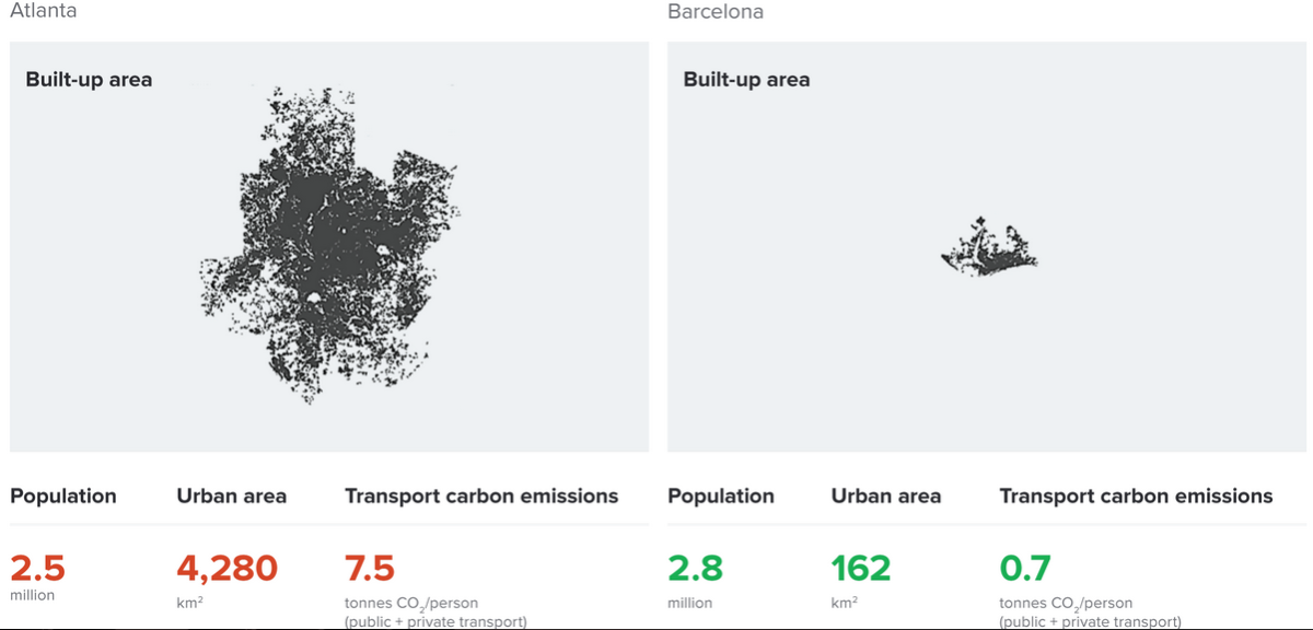 L'étude chiffre ainsi à 400 milliards de dollars le seul coût que pose à l'économie américaine l'extension urbaine annuelle actuelle. Sans parler du coût écologique : la comparaison ci-dessous entre les villes d'Atlanta et de Barcelone, aux populations similaires mais aux superficies diamétralement opposées (4280km² à Atlanta, 162 à Barcelone) indique des émissions de carbone dues aux transports presque 11 fois supérieures dans le premier cas.