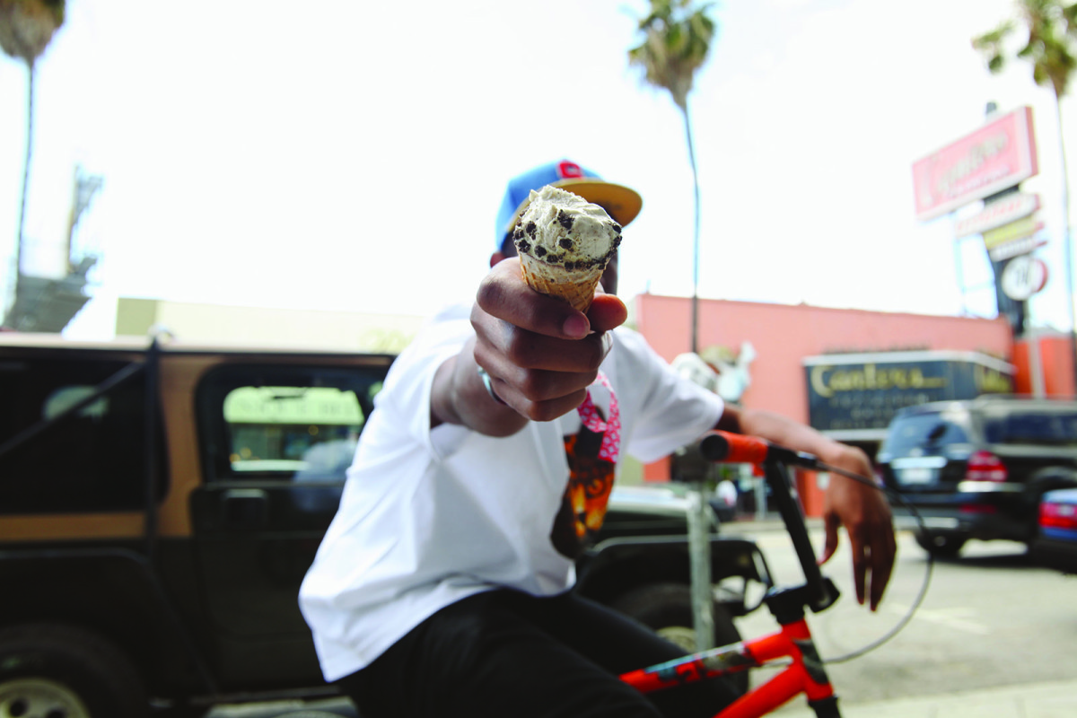 "C'était un weekend d'avril 2012, un samedi exactement. C'était le premier samedi du festival Coachella et j'étais sur Fairfax à Los Angeles. Bizarrement, la rue était calme car tout le monde étaient dans le désert pour Coachella. Je marchais, je prenais mes photos et là je croise Tyler The Creator et son équipe, il y avait Jason Dill aussi. Il avait une glace à la main et il roulait en BMX, moment très rare. Je ne pensais pas que 5 ans plus tard cette photo pourrait coller parfaitement dans mon projet d'ice cream shots."