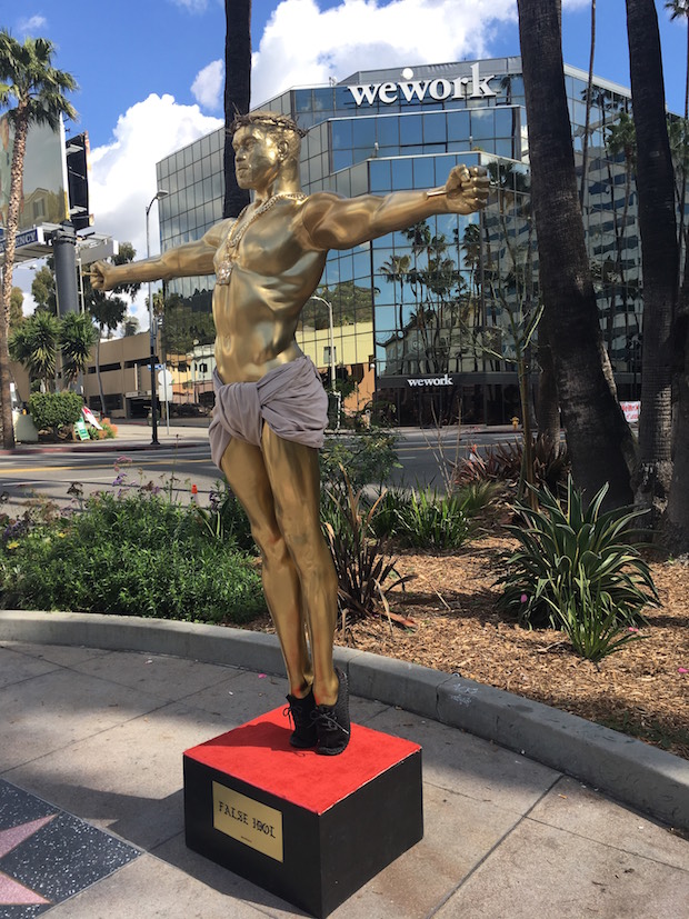 Ce Jésus a un visage bien familier... Car c'est celui de Kanye West. Les pieds joints de cet étrange idole sont couverts par des sneakers : les Yeezy Boost 350, précisément, un modèle commercialisé par le rappeur.Mais que se passe-t-il sur Hollywood Boulevard ? Le magazine The Hollywood Reporter a fini par trouver la réponse.