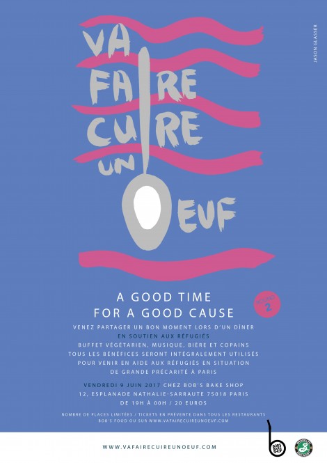 L'événement se tiendra vendredi 9 juin de 19h à minuit chez Bob's Bakeshop. Ce coffee-shop/boulangerie partenaire de Va faire cuire un œuf est situé au cœur de la Halle Pajol dans le XVIIIe arrondissement parisien, quartier du Nord de Paris qui cristallise les enjeux et les tensions liés à l'accueil des réfugiés.