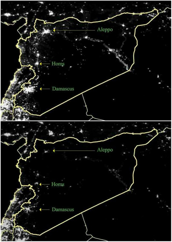 étudiant des images produites par un satellite américain, ils ont conclu qu'en Syrie, les lumières allumées lorsqu'il qu'il fait nuit ont décliné d'environ 74% entre mars 2011 - date qui marque le début du conflit - et février 2014.